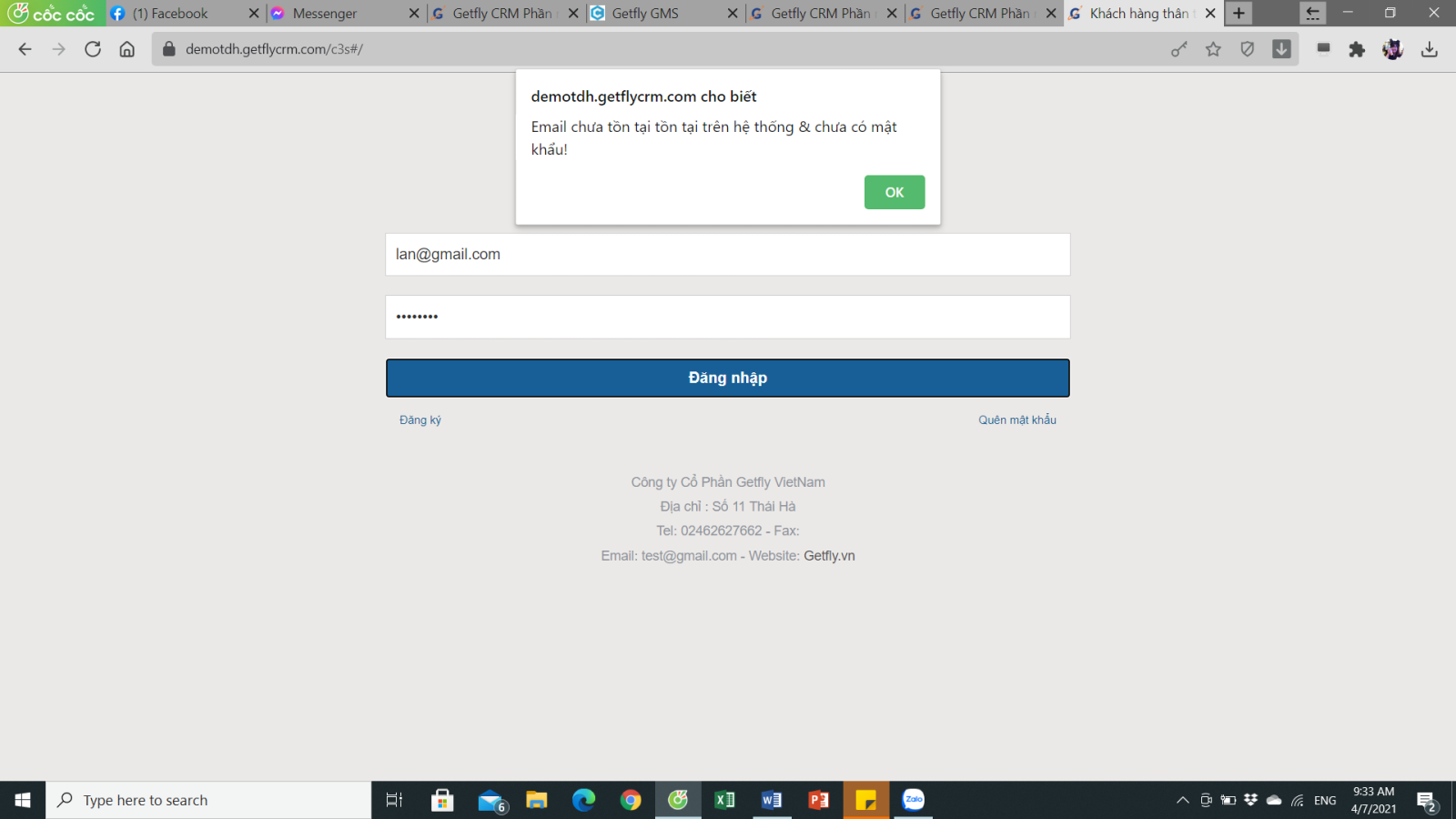 Trường hợp email đã tồn tại trên hệ thống Getfly: