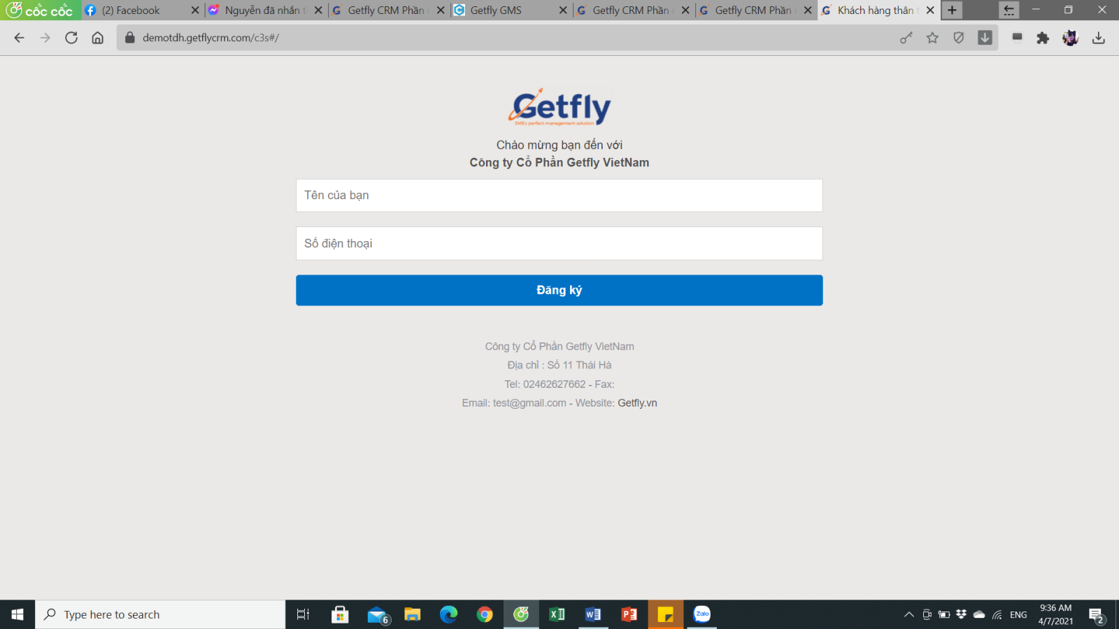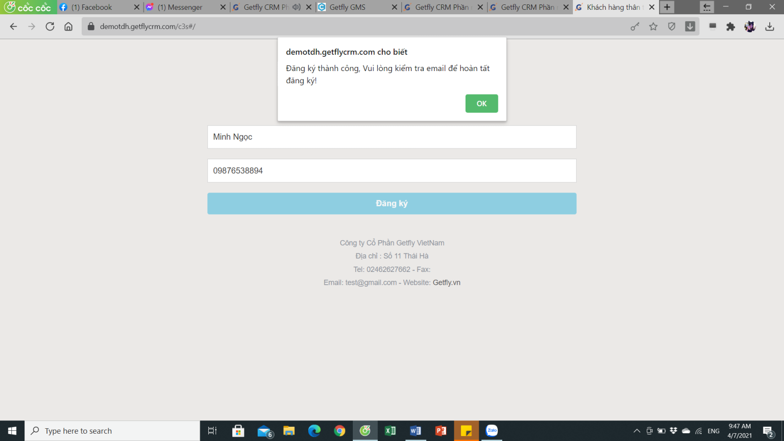 Điền số điện thoại để Getfly có thể liên hệ với anh chị
