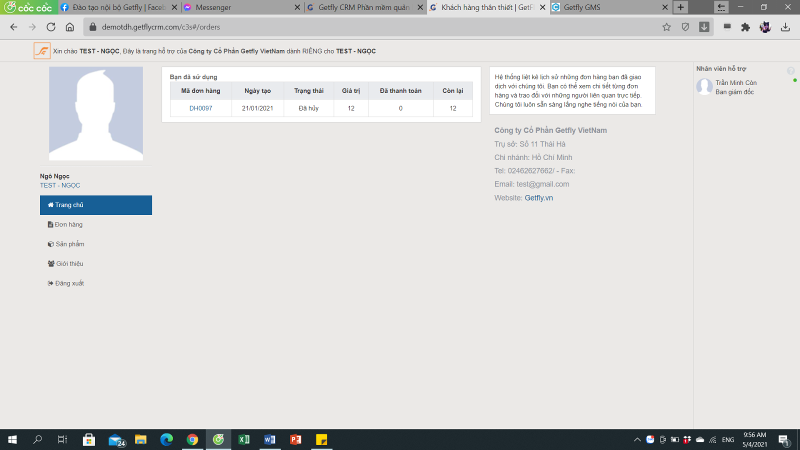 Đơn hàng: hiển thị những đơn hàng bạn đã mua từ Getfly, giá trị và công nợ