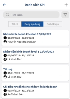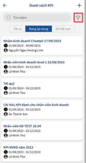 Tại màn hình Danh sách KPI trên App bạn cũng sẽ lọc được: Tất cả danh sách KPI, danh sách KPI đang áp dụng, đã hết hạn.