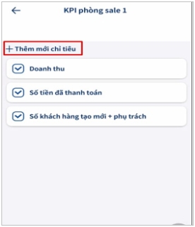 Sẽ hiển thị ra các chỉ tiêu KPI trong nhóm đó và tại đây bạn cũng có thể bổ sung nhanh thêm các chỉ tiêu KPI bằng cách Click vào ” + Thêm mới chỉ tiêu”