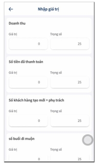 - Tại phần này cũng như trên PC trọng số sẽ được tự động chia đều cho các chỉ tiêu, bạn có thể chủ động điều chỉnh lại trọng số cho từng chỉ tiêu.