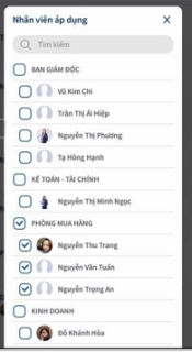 (3) Chọn danh sách nhân viên áp dụng: bạn có thể tích chọn theo từng nhân viên hoặc tích vào phòng ban sẽ tích tất cả danh sách nhân viên trong phòng ban đó