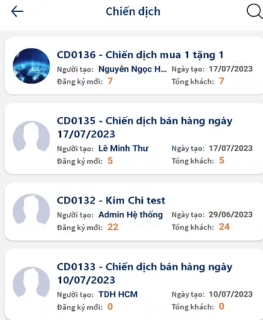 Ở màn hình chiến dịch, bạn sẽ nhìn được tất cả các chiến dịch mà bạn là người tạo, là người phụ trách hoặc liên quan trong chiến dịch. Mỗi chiến dịch sẽ hiển thị người tạo, ngày tạo, đăng ký mới và tổng khách.