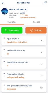 Màn hình Chi tiết cơ hội hiển thị ra các thông tin đầy đủ của cơ hội đó. Bạn có thể thay đổi người phụ trách, xác suất cơ hội, doanh thu dự kiến, phương pháp tiếp cận (trạng thái cơ hội) và thời gian kết thúc cơ hội dự kiến.