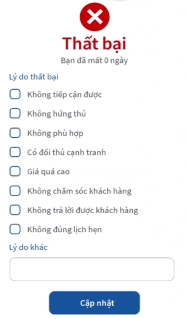 Click Thất bại xong, bạn lựa chọn lý do thất bại và click Cập nhật