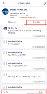 Khi anh chị click vào mục Trao đổi, bạn sẽ thấy được các bình luận và trao đổi của các nhân viên với cơ hội- khách hàng này (Phần trao đổi trong cơ hội- chiến dịch sẽ link với trao đổi trong Chi tiết khách hàng).