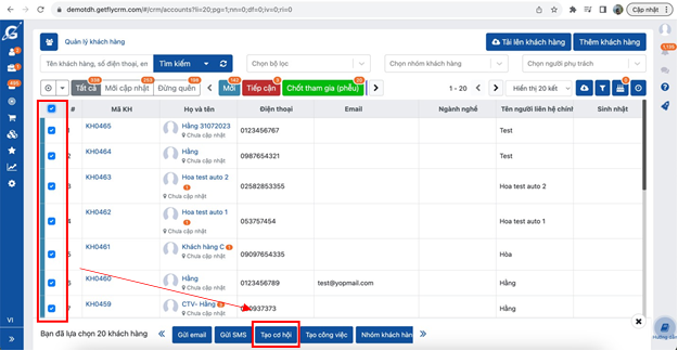 Tại trang quản lý khách hàng F2 => Lọc tất cả những KH phù hợp với chiến dịch => Tích chọn để thao tác đồng thời nhiều khách hàng => Tạo cơ hội