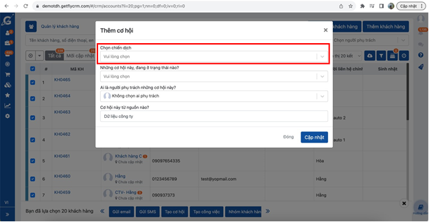 Sau đó chọn chiến dịch => Điền các thông tin cần thiết tương tự như cách 1=> Cập nhật để đưa khách hàng vào chiến dịch
