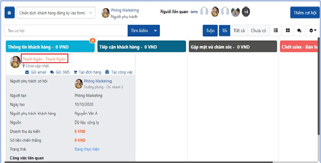 (4) Thông tin cơ hội: hiển thị thông tin chi tiết của cơ hội đó. Đơn hàng liên quan: thêm mới đơn hàng bán để theo dõi xem khách hàng đó phát sinh đơn hàng từ chiến dịch nào. Báo giá liên quan: thêm mới báo giá để theo dõi và thống kê được các báo giá liên quan đến khách hàng được tạo ra từ chiến dịch nào. Công việc liên quan: thêm mới công việc từ chiến dịch để ghi nhận lại log và theo dõi được công việc đó được tạo ra từ chiến dịch nào.