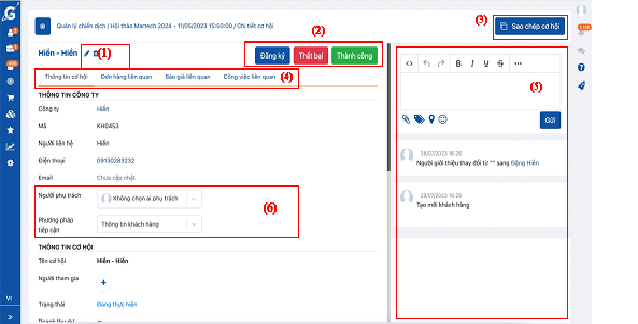 (6) Tại đây có thể thay đổi trạng thái của cơ hội, thay đổi người phụ trách cơ hội.