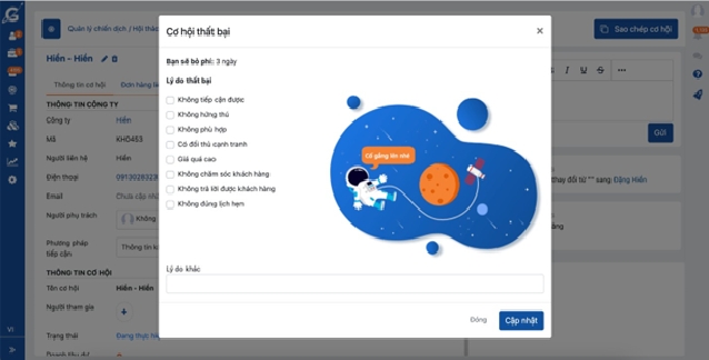 Có thể lựa chọn lý do thất bại và cập nhật.