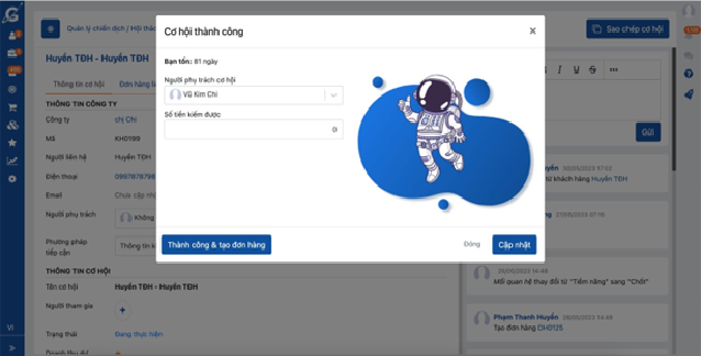-Thành công: khi click vào thành công hệ thống hoặc khi cập nhật khách hàng sang trạng thái cuối cùng của phương pháp tiếp cận, hệ thống sẽ hiển thị như hình dưới đây. Khi đó hệ thống sẽ hiểu trạng thái cuối chính là thành công, bạn điền số tiền kiếm được và ấn cập nhật hoặc Thành công và tạo đơn hàng => Hệ thống sẽ điều hướng sang 1 trang tạo mới đơn hàng và ghi nhận được tạo từ chiến dịch đó.
