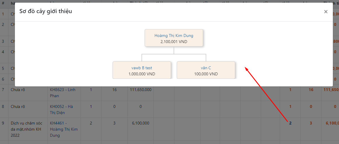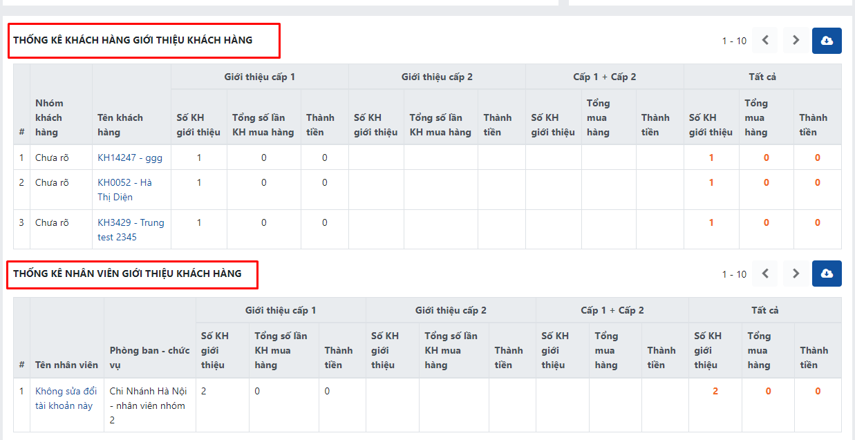Bảng này sẽ thống kê toàn bộ khách hàng giới thiệu KH có số lượng KH đó giới thiệu và trong số những KH đó giới thiệu thì có bao nhiêu KH mua hàng và giá trị mua là bao nhiêu.