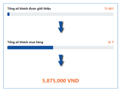 Ví dụ: Tổng số khách được giới thiệu 7/421: Có 7 khách hàng được giới thiệu trên tổng số 421 khách hàng được tạo mới. Tổng số khách mua hàng 3/7: trong đó có 3 khách hàng mua hàng trong tổng số 7 khách hàng được giới thiệu. Tổng giá trị mua hàng của 3 khách đấy là 5,875,000 VND.