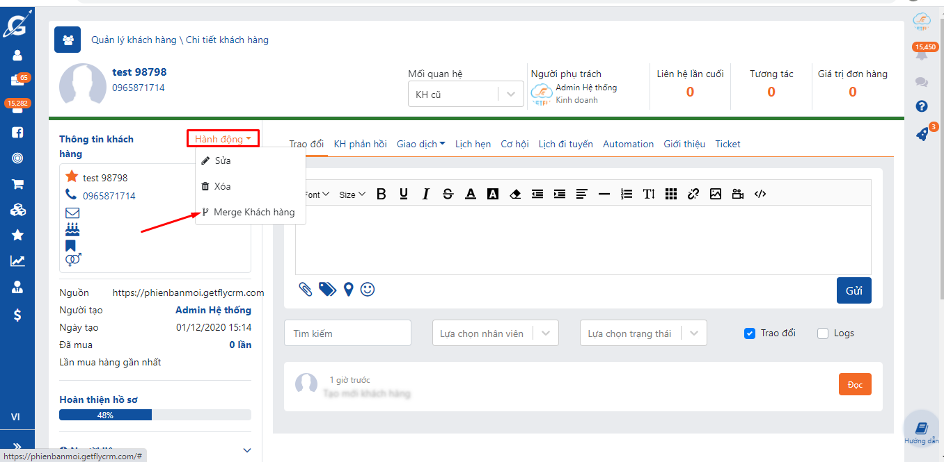 Bước 1: Để gộp thông tin khách hàng A vào khách hàng B, bạn vào chi tiết khách hàng B >> Click Hành động >> Click Merge khách hàng: Sẽ hiển thị popup Merge khách hàng