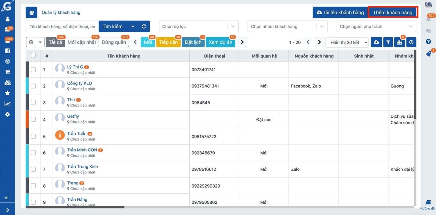 - Mối quan hệ: là các trạng thái của khách hàng được xây dựng dựa theo quy trình bán hàng của doanh nghiệp. Như trên Getfly gợi ý bạn các trạng thái của khách hàng như: Mới – Tiếp cận – Tiềm năng – Nóng – Mất – Chốt. Việc phân loại các trạng thái khách hàng này, bạn sẽ ưu tiên được mức độ chăm sóc khách hàng và đánh giá được năng lực xử lý khách hàng của mình.