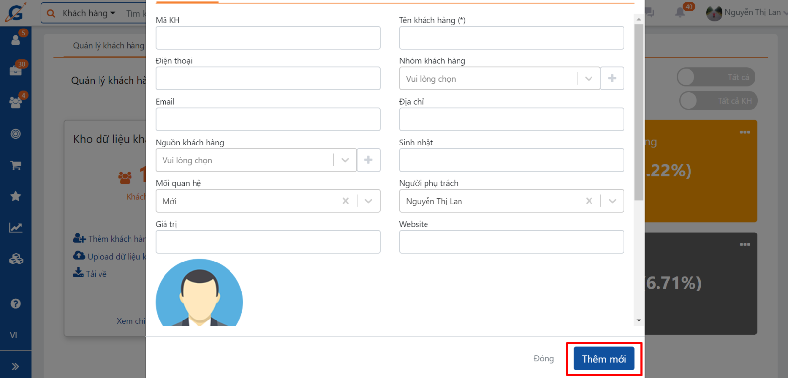 Bạn chọn vào mục Thêm mới khách hàng màn hình sẽ hiển thị giao diện thêm mới khách hàng tương tự như cách 1: