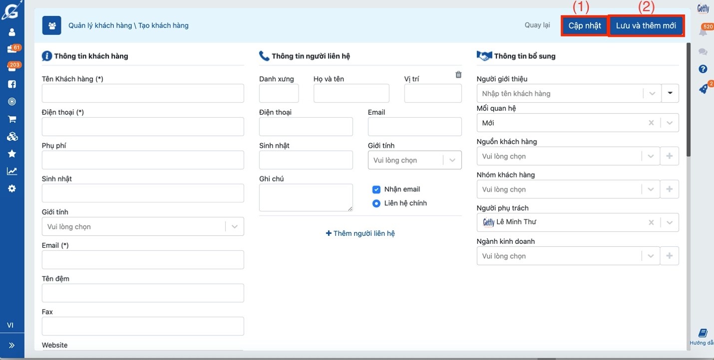 (2) Bạn dùng phần lưu và thêm mới khi cập nhật nhiều khách hàng. Khi bạn chọn vào nút lưu và thêm mới hệ thống sẽ tiếp tục hiển thị bảng để tạo khách hàng mới.