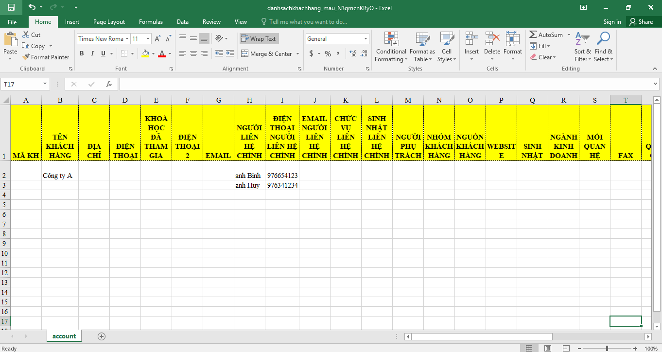 3. Trong trường hợp khách hàng có nhiều người liên hệ, bạn sẽ điền dữ liệu vào cột điện thoai/email của liên hệ chính. Mỗi thông tin liên hệ bạn sẽ để ở một dòng nhé.