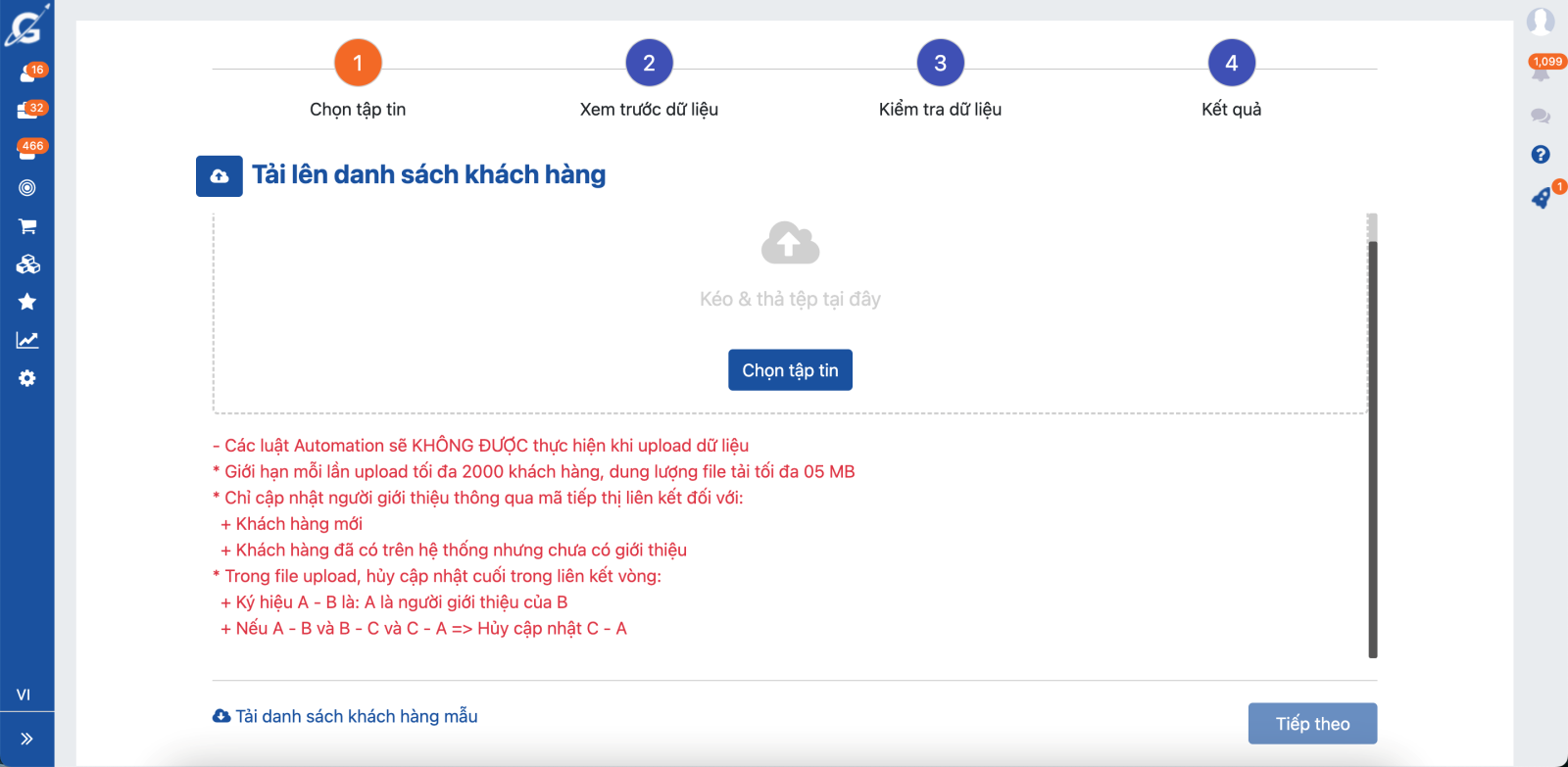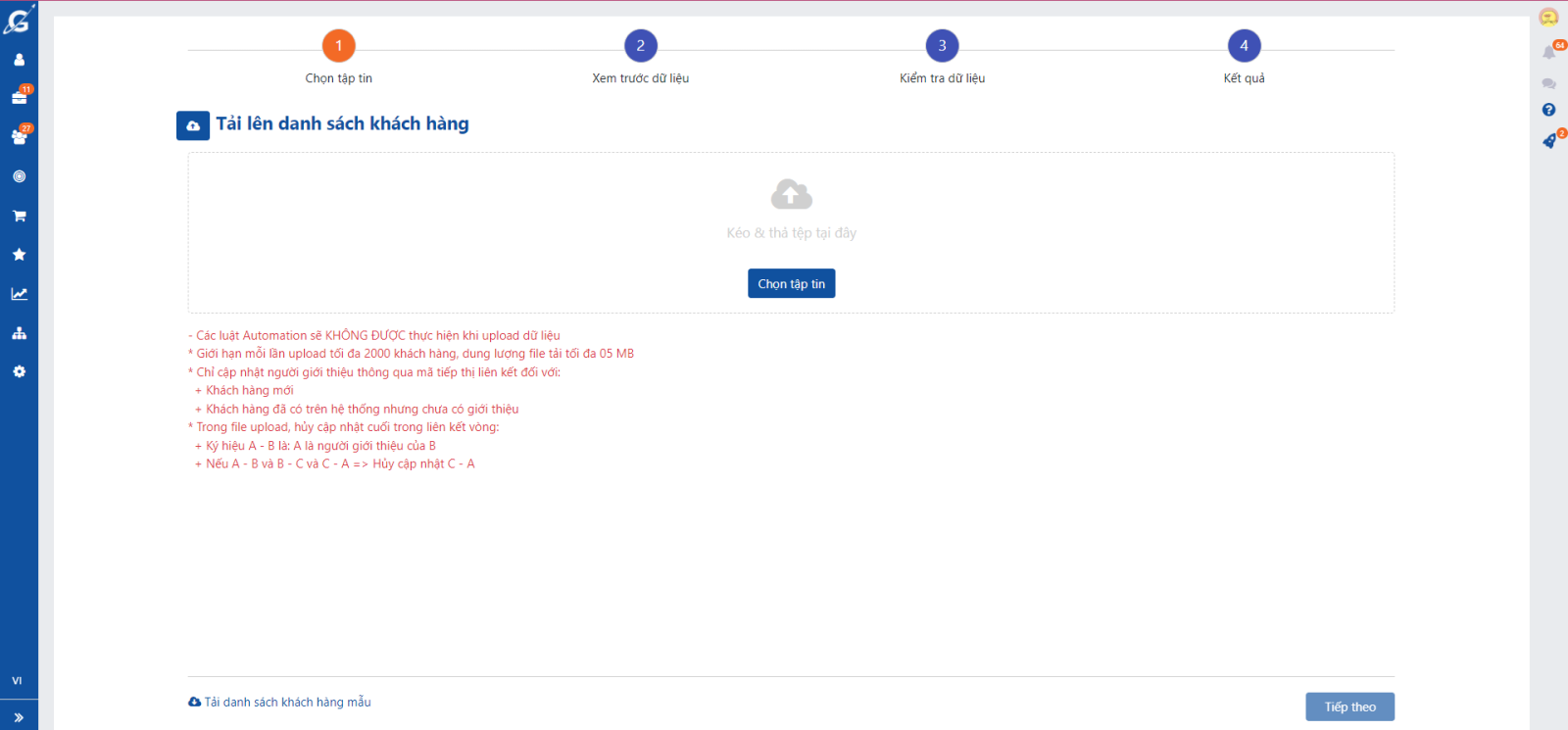 Giới hạn mỗi lần tải lên là 2000 dòng, dung lượng file tối đa là 5mb. Với trường hợp có nhiều hơn dữ liệu quy định bạn vui lòng tách thành nhiều file.
