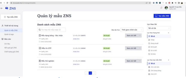 Cần có mẫu template ZNS: https://zns.oa.zalo.me/zns/manage/template
