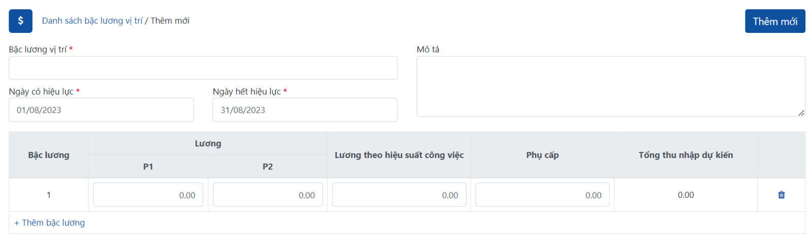 (2) Lương: Cài đặt mức lương cơ bản đạt được và mức lương theo bậc của vị trí tương ứng.