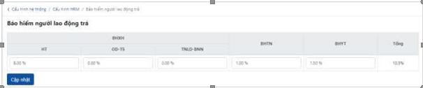 NLĐ đóng: Thiết lập Cài đặt >> HRM >> Bảo hiểm >> NLĐ đóng