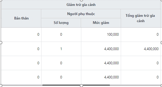 - Tổng giảm trừ gia cảnh= Giảm trừ gia cảnh bản thân + Số lượng người phụ thuộc * Mức giảm người phụ thuộc.