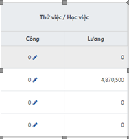 - Công: mặc định giá trị bằng 0 tuy nhiên anh/ chị click công thử việc của nhân sự đó căn cứ theo bảng chấm công.để cập nhật số ngày