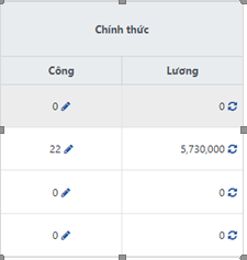 - Công: Tính theo kết quả chấm công của nhân viên. Ngoài ra có thể chủ động cập nhật giá trị bằng cách click vào biểu tượng