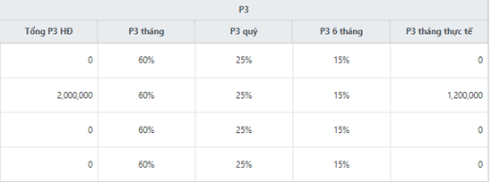 - P3 6 tháng của 1 tháng = P3 theo HĐ * % P3 6 tháng * % KPI tháng.