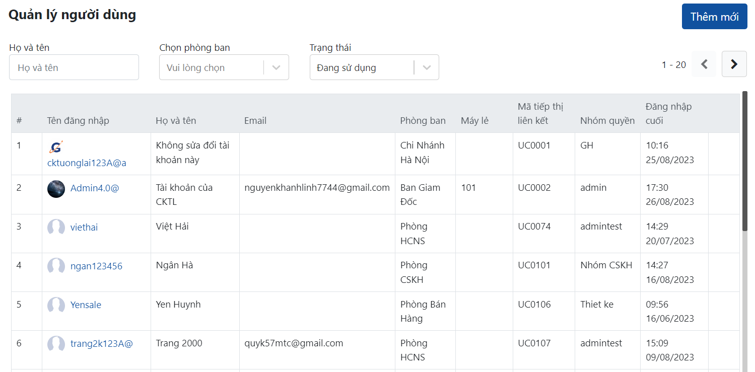 Những thông tin cơ bản như: Họ và Tên, số điện thoại, phòng ban vị trí sẽ được link từ phần Cài đặt >> Quản lý người dùng mà Admin hệ thống bước đầu đã tạo.