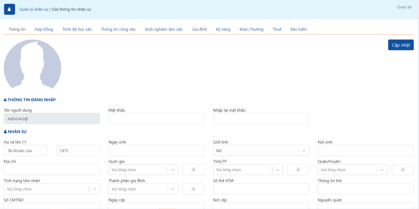 Phần này hành chính nhân sự sẽ cập nhật bổ sung thông tin hồ sơ của từng nhân sự.