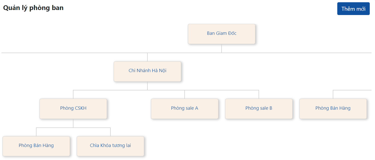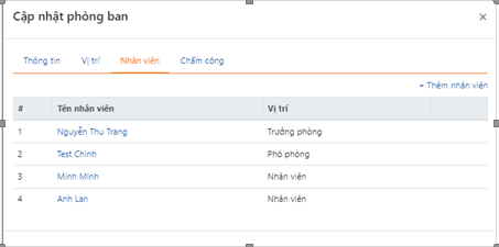 Anh/ chị click trực tiếp vào phòng ban tương ứng để nắm được: thông tin liên quan tới phòng ban, trong phòng ban đó có những vị trí nào, những nhân viên nào nằm trong phòng ban đó: