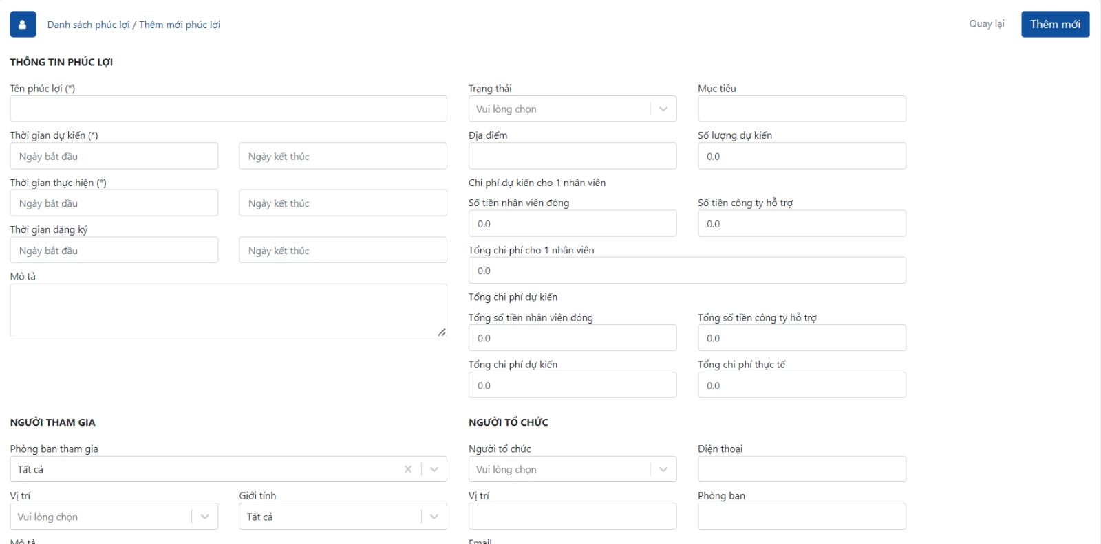 Để thiết lập các phúc lợi anh/ chị truy cập HRM >> chọn Phúc lợi