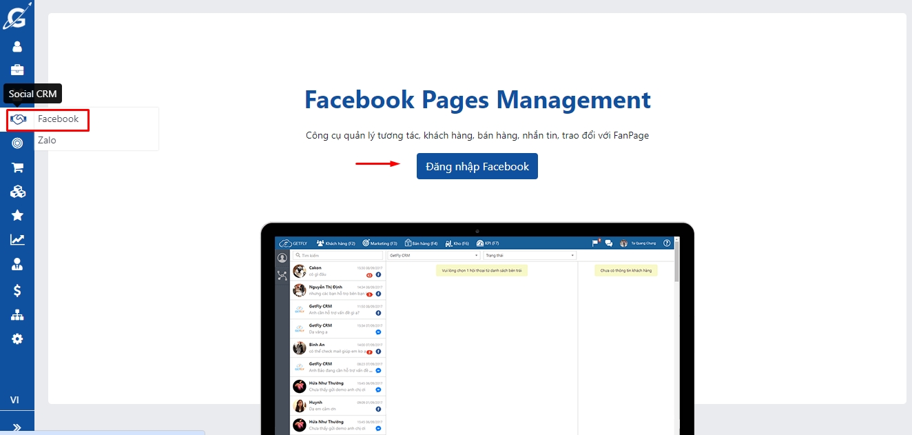 Tài khoản của anh chị cần đăng kí sử dụng Module Social của Getfly. Để sử dụng tính năng quản lý Fanpage trên hệ thống: